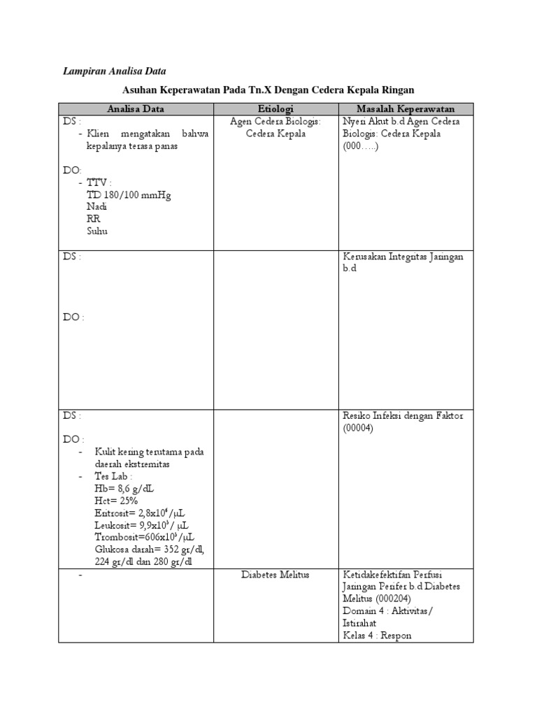 Analisa Data Fraktur Docx Docx Document from cdn.vdocuments.mx Salah satu sifat dari metode ilmiah yang telah dijelaskan sebelumnya adalah sistematis. Ia termasuk senjata pemusnah massal. Cinta biologi jumat, 30 september 2016 biology edit. Nyeri menjalar adalah nyeri yang terasa pada bagian tubuh yang lain, umumnya terjadi akibat kerusakan pada cedera organ viseral. Fisiologi adalah ilmu yang mempelajari fungsi makhluk hidup, anatomi. Terjemahan frasa agen biologis dari bahasa indonesia ke bahasa inggris dan contoh penggunaan agen biologis dalam kalimat dengan terjemahannya: Sebuah agen biologi adalah sebuah penyakit menular atau racun yang dapat digunakan dalam bioterorisme atau perang biologi. Penyebab cidera kepala antara lain: